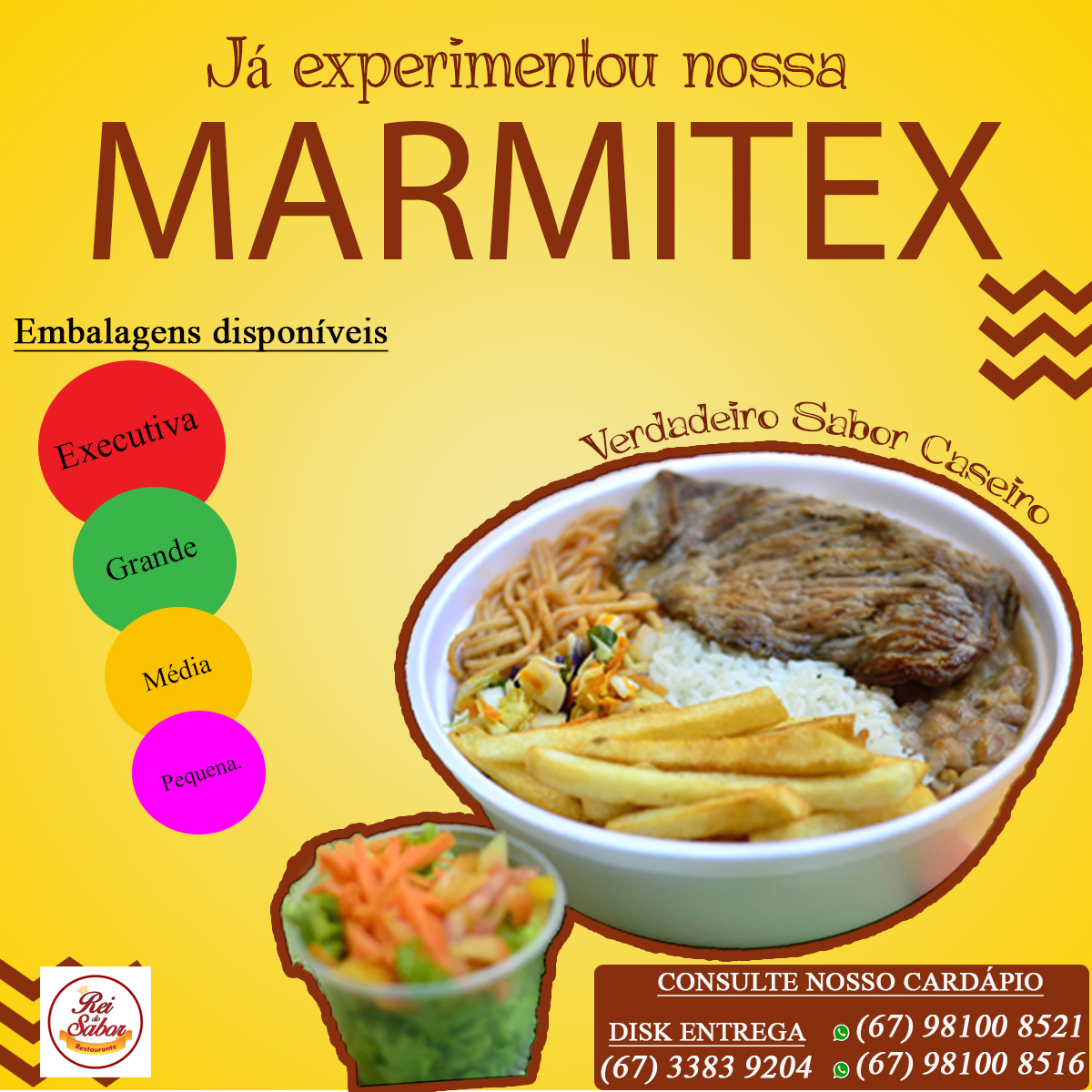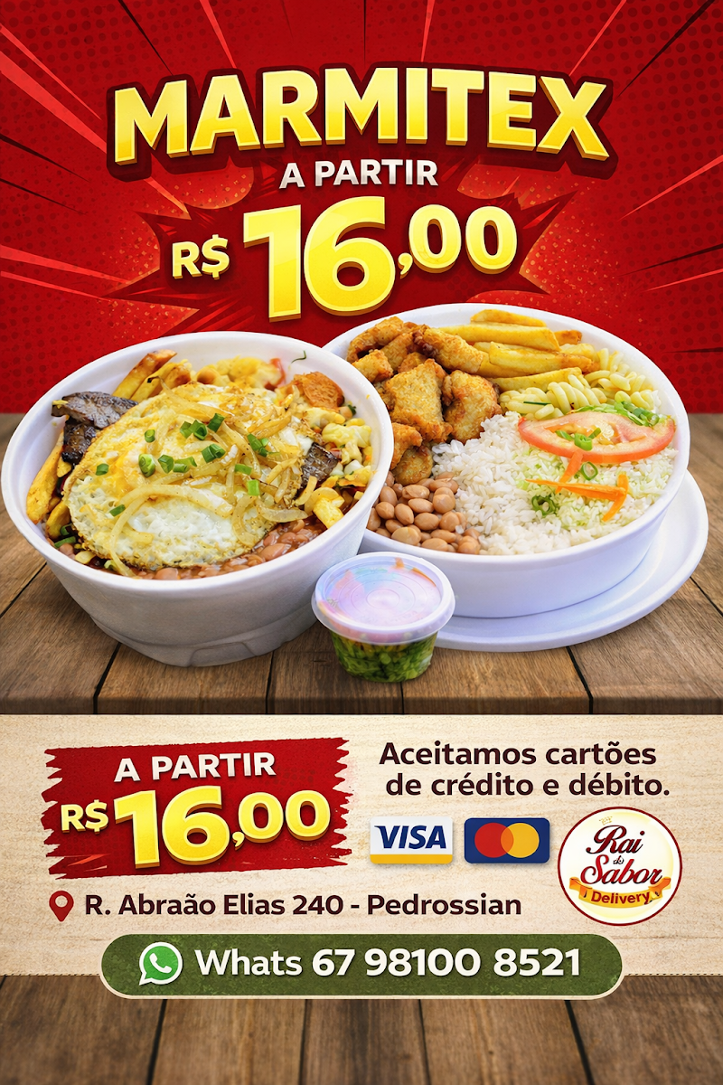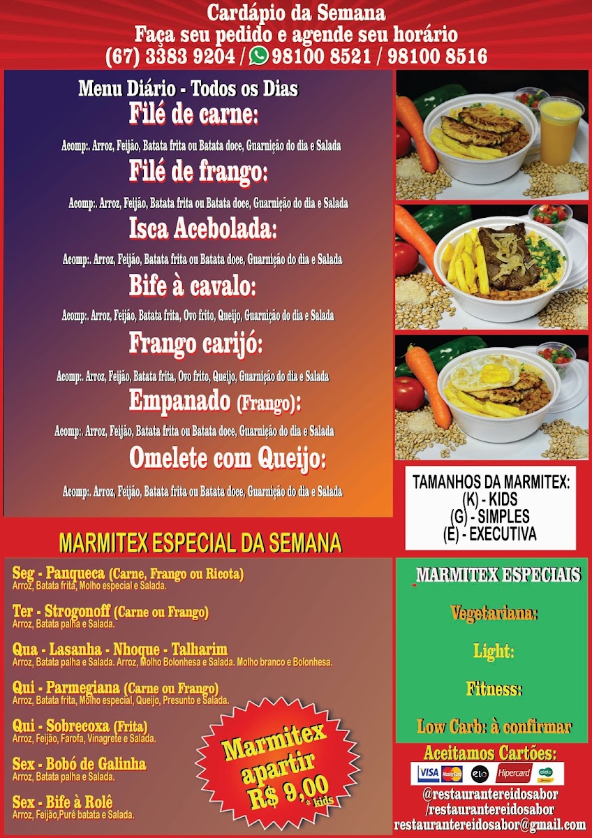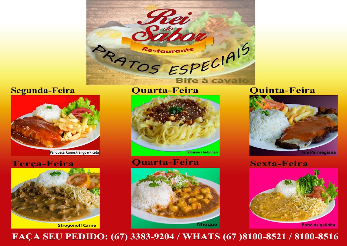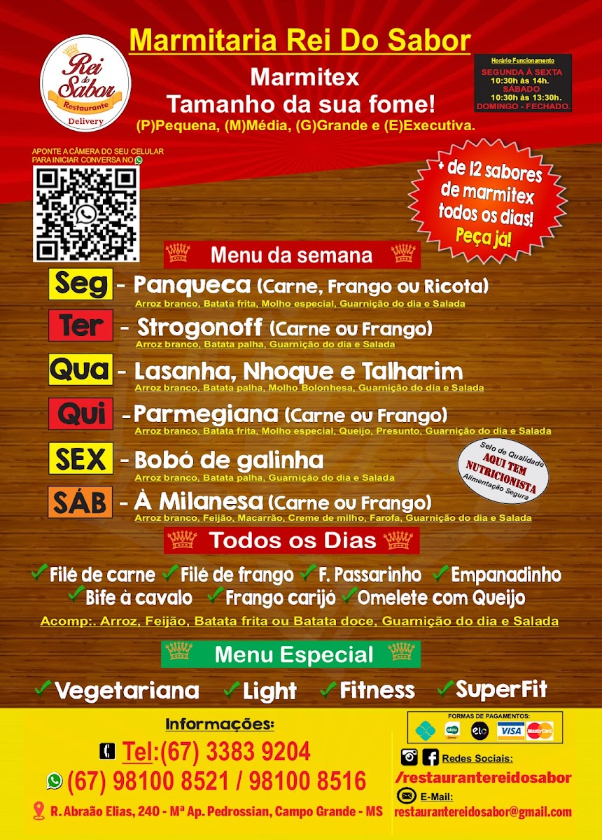 From a reviewer’s perspective, the menu at Marmitaria - Restaurante Rei Do Sabor offers a comforting selection of everyday Brazilian favorites with a focus on hearty, homemade-style meals. The daily options include Filé de carne, Filé de frango, Bife à cavalo, Frango carijó, and Omelete com Queijo, which provide simple yet satisfying choices for those looking for classic, well-prepared dishes. The weekly menu adds more variety, featuring dishes such as Panqueca (Carne), Strogonoff (Carne ou Frango), Nhoque de Mandioca, Macarrão Talharim, Parmegiana (Carne ou Frango), and Bobó de galinha, giving customers a rotating selection that keeps the menu interesting while still focusing on traditional, comforting flavors. Overall, the menu stands out for its variety of meat and pasta dishes, offering familiar, filling meals that appeal to those seeking affordable, home-style Brazilian cuisine.