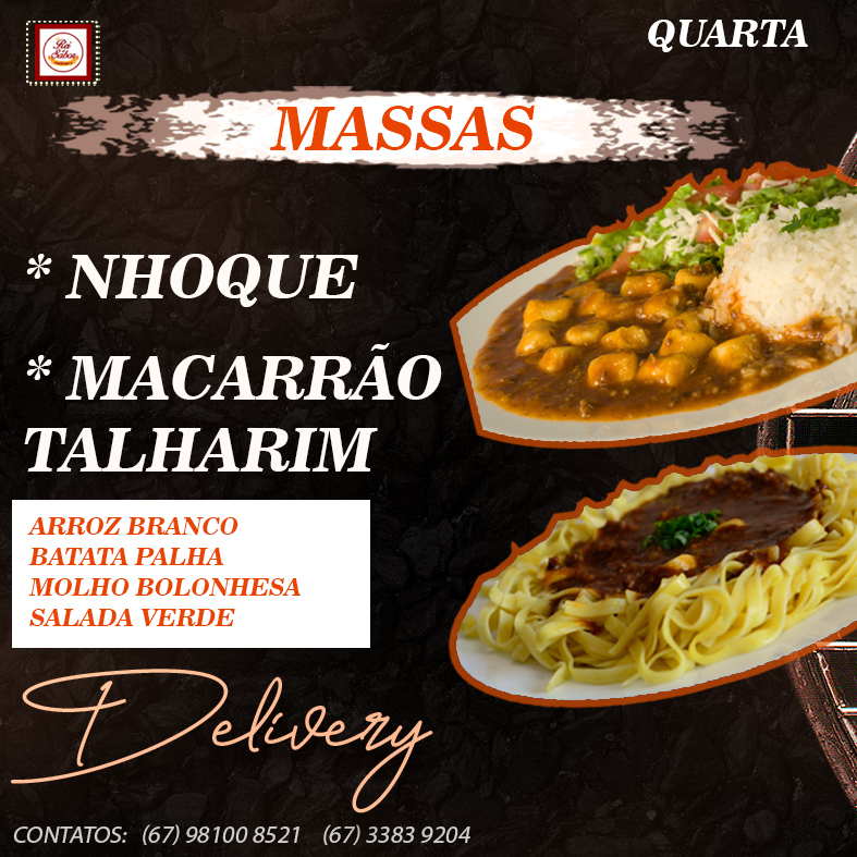 Arroz branco, Feijão, Macarrão, Creme de milho, Farofa, Guarnição do dia e Salada