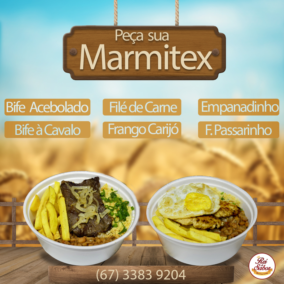 Acomp:. Arroz, Feijão, Batata frita ou Batata doce, Guarnição do dia e Salada